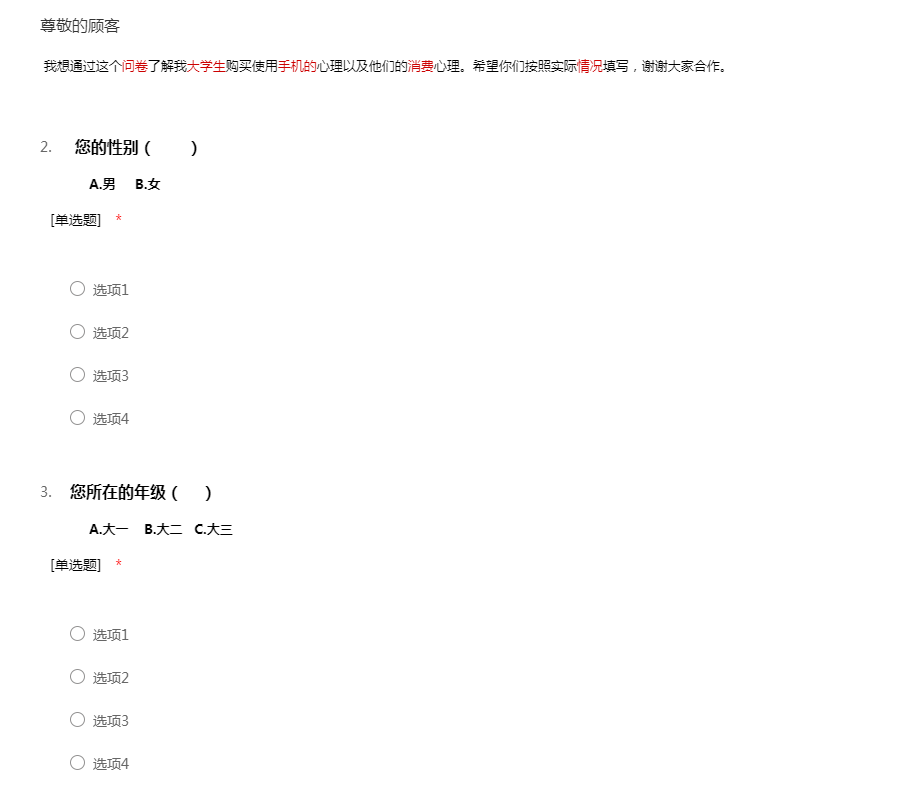 我想通过这个问卷了解我大学生购买使用手机的心理以及他们的消费心理。希望你们按照实际情况填写,谢谢大家合作。