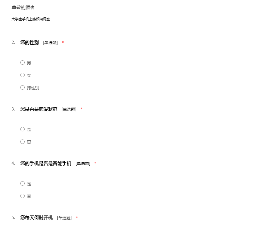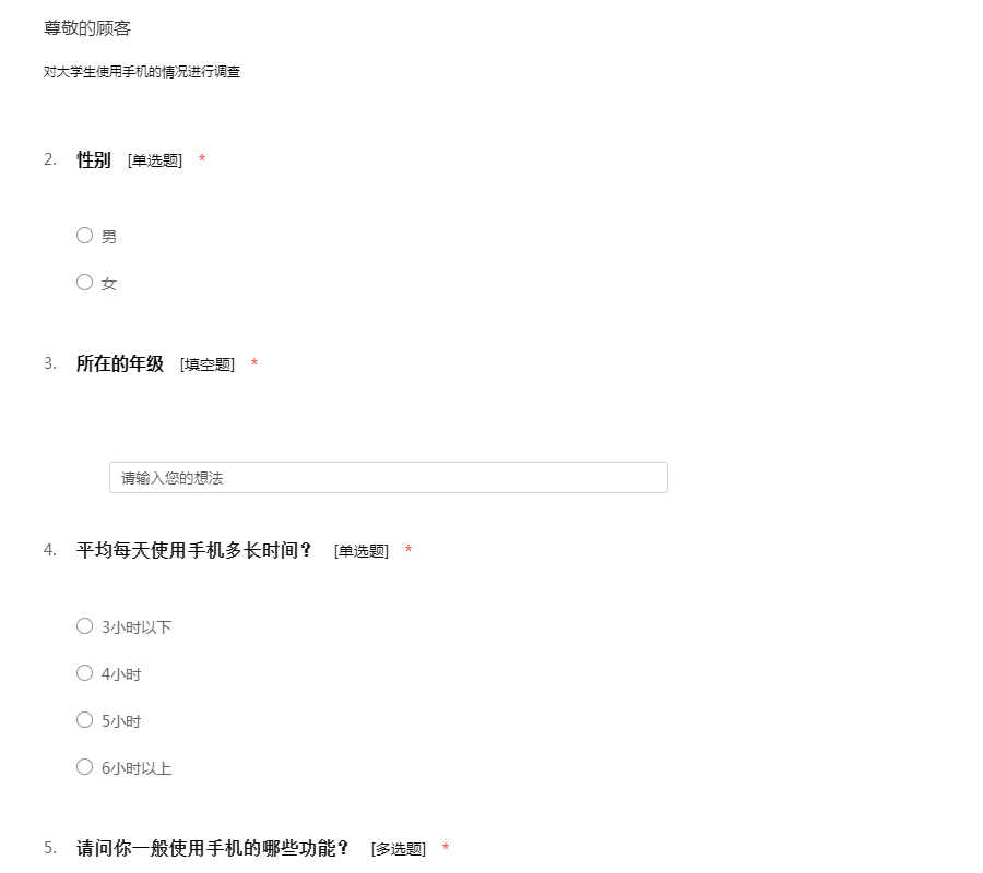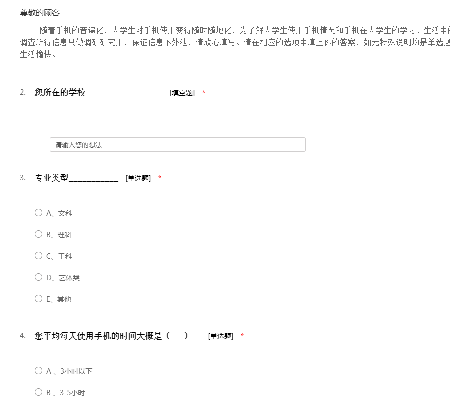 您好!我是一名在读大学生,我最近在进行一个关于大学生手机使用的调研活动,特向您征求相关意见及建议。此次问卷采取不记名形式,您的回答将完全保密;您的意见将成为此次调研的重要依据,期待收到您完整的答卷,谢谢!