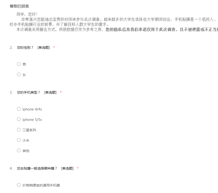 同学,您好! 非常高兴您能抽出宝贵的时间来参与此次调查。越来越多的大学生选择在大学期间创业,手机贴膜是一个低投入、自由的选择,所以设置问卷以了解高校中手机贴膜行业的前景,并了解目标人群大学生的需求。 本次调查采用匿名方式,所获数据仅作为参考之用,您的隐私信息我们承诺仅用于此次调查,且不被泄露或不正当使用。衷心感谢您的支持和协助!
