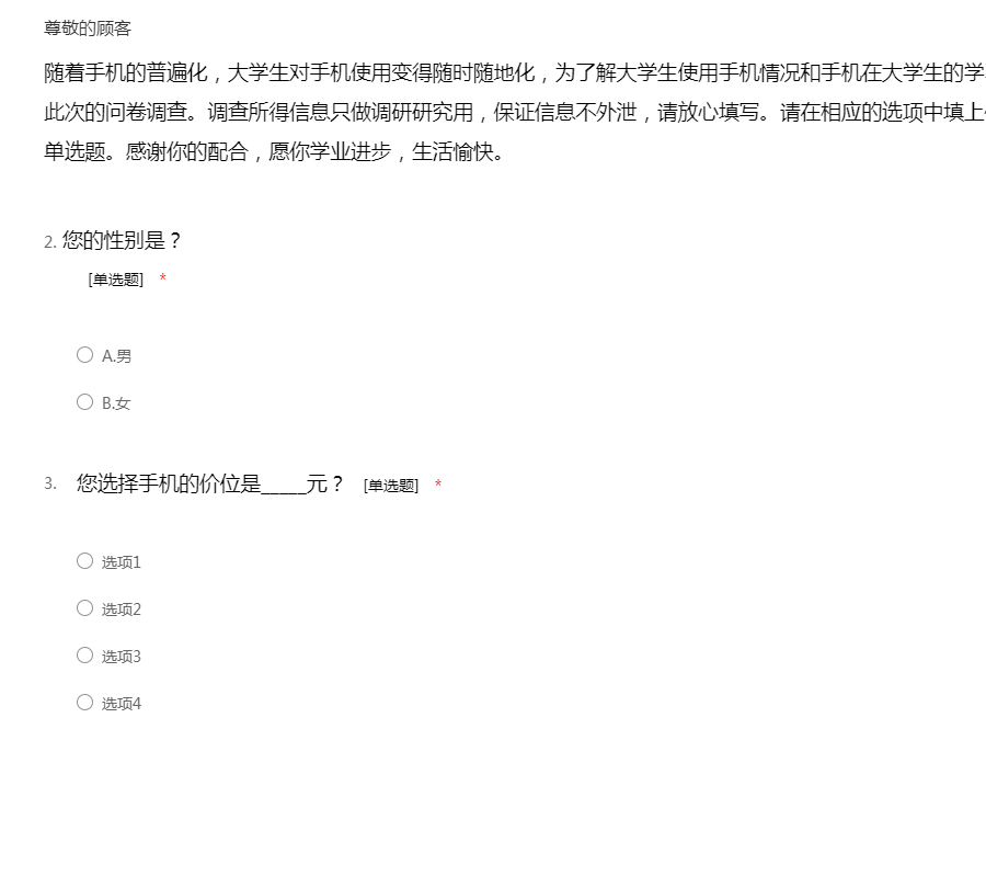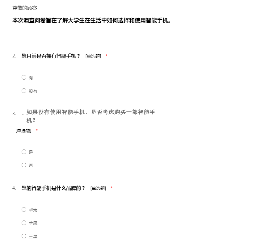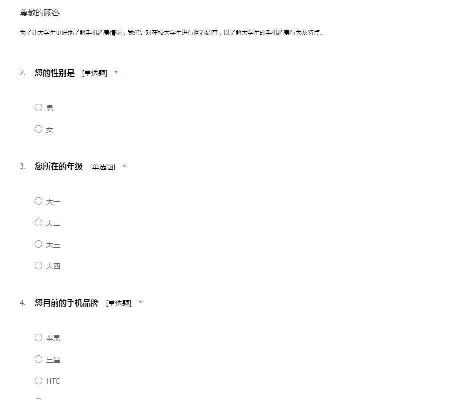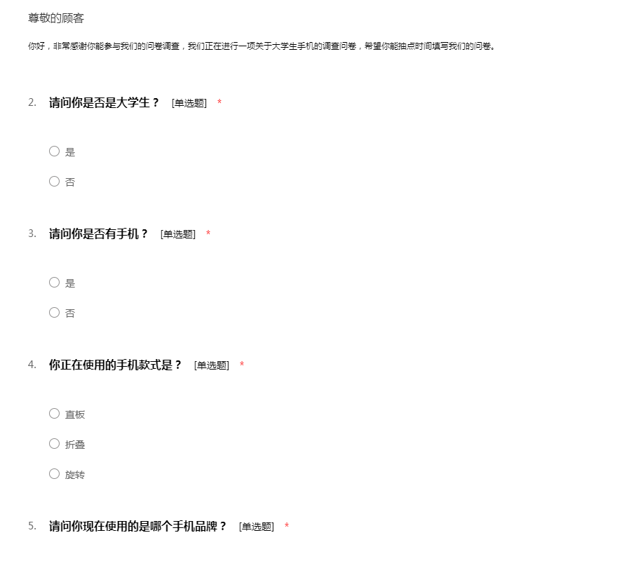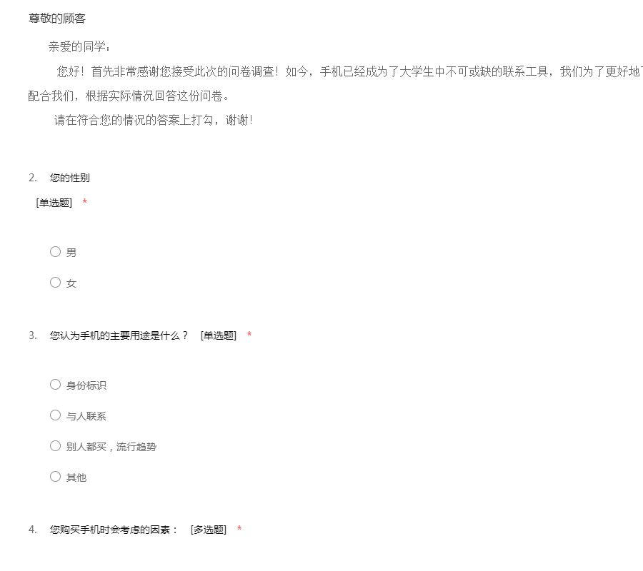 您好!我是一名在读大学生,我最近在进行一个关于大学生手机使用的调研活动,特向您征求相关意见及建议。此次问卷采取不记名形式,您的回答将完全保密;您的意见将成为此次调研的重要依据,期待收到您完整的答卷,谢谢!