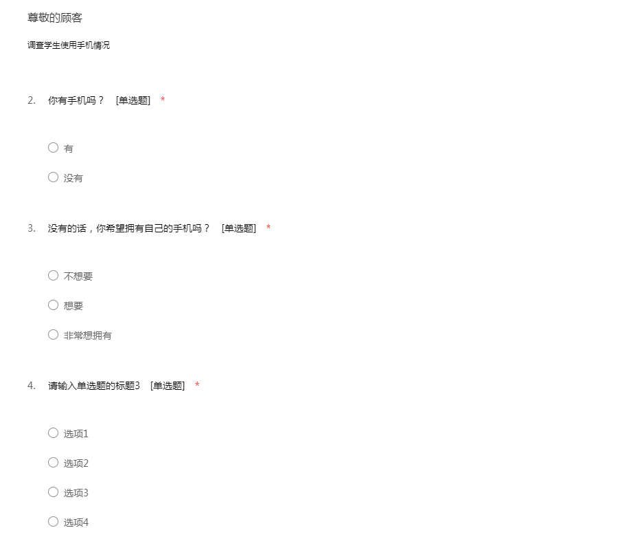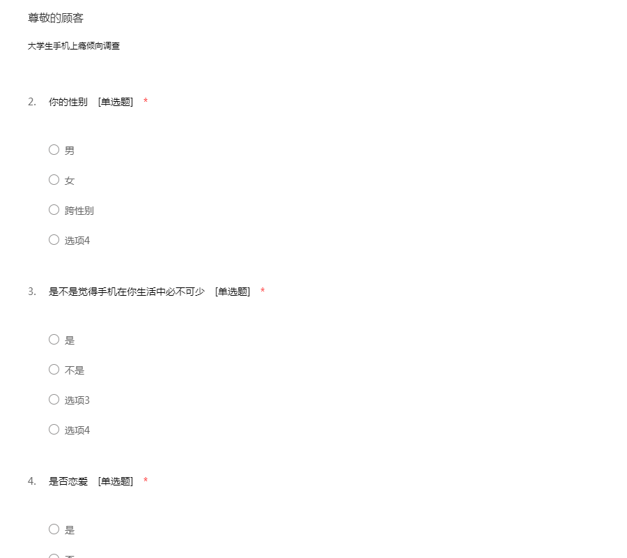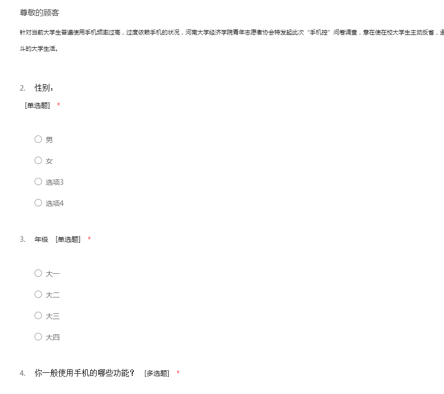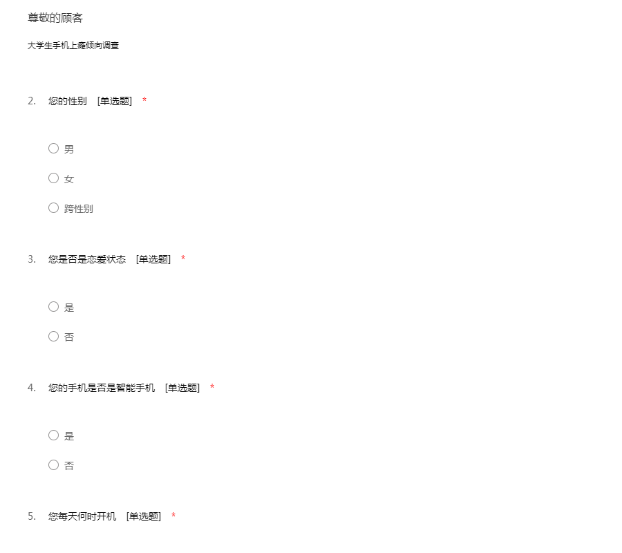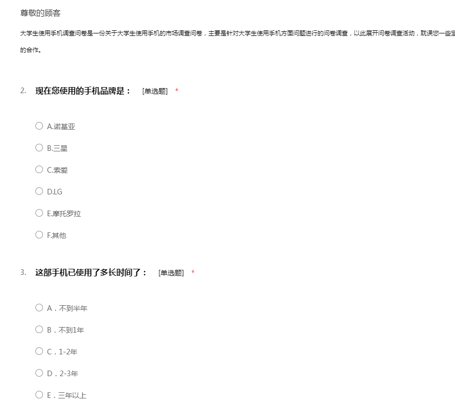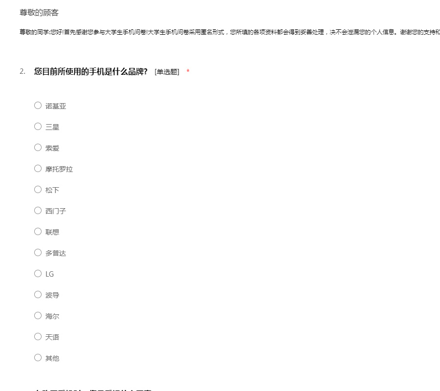 您好!我是一名在读大学生,我最近在进行一个关于大学生手机使用的调研活动,特向您征求相关意见及建议。此次问卷采取不记名形式,您的回答将完全保密;您的意见将成为此次调研的重要依据,期待收到您完整的答卷,谢谢!