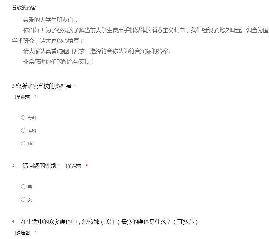 亲爱的大学生朋友们: 你们好!为了客观的了解当前大学生使用手机媒体的消费主义倾向,我们组织了此次调查。调查为匿名问卷,所得数据我们只作为学术研究,请大家放心填写! 请大家认真看清题目要求,选择符合你认为符合实际的答案。 非常感谢你们的配合与支持!