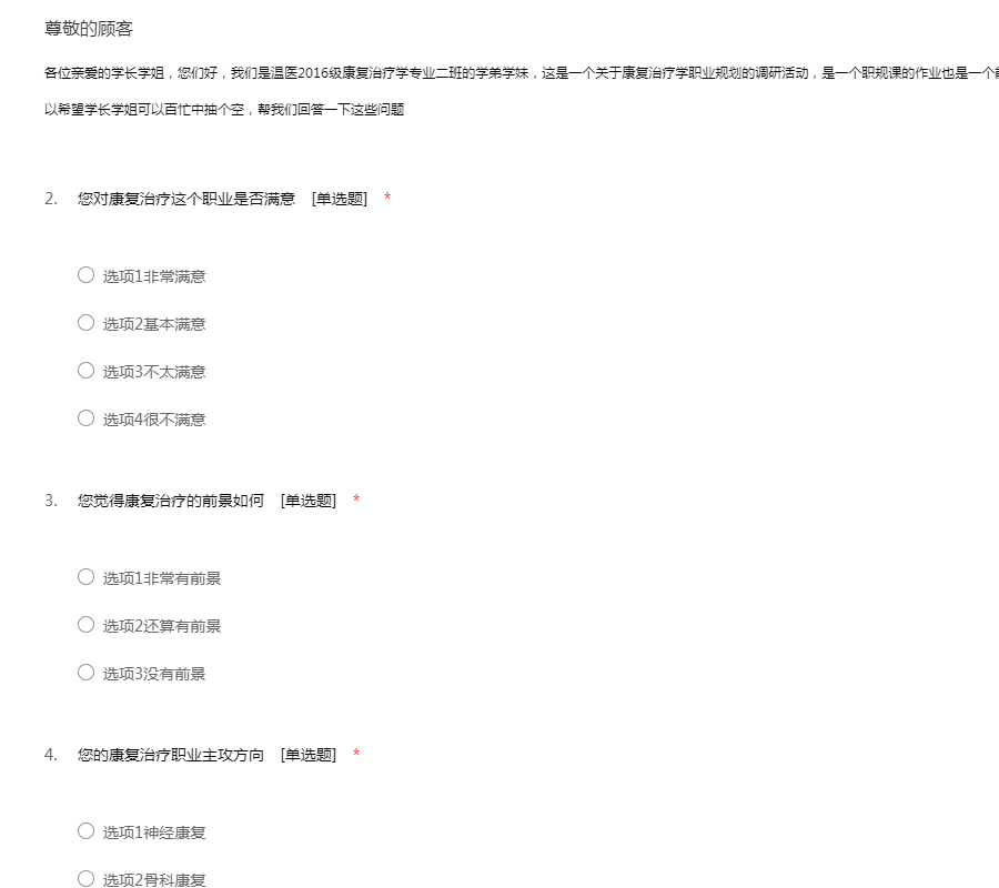 各位亲爱的学长学姐,您们好,我们是温医2016级康复治疗学专业二班的学弟学妹,这是一个关于康复治疗学职业规划的调研活动,是一个职规课的作业也是一个能让我们更好了解我们这个专业的一个途径。所以希望学长学姐可以百忙中抽个空,帮我们回答一下这些问题