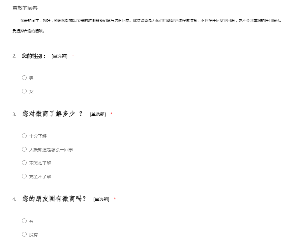 亲爱的同学: 您好,感谢您能抽出宝贵的时间帮我们填写这份问卷。此次调查是为我们市场研究课程做准备,不存在任何商业用途,更不会泄露您的任何隐私。 微商是指运用社会化移动营销工具,进行商业活动的个人、企业或组织。本问卷针对大学生微商市场进行调查,请根据您的真实感受选择合适的选项。