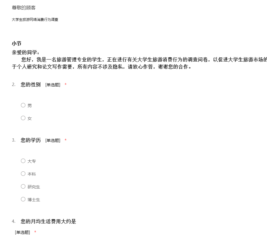 亲爱的同学:您好!为了了解大学生旅游态势现状,我们正在网上调查。非常感谢您能够作为其中一员参加调查,提供您的看法和意见,希望得到您的合作。本调查不记名,请放心填写。能得到您宝贵的意见,我们十分荣幸。谢谢!