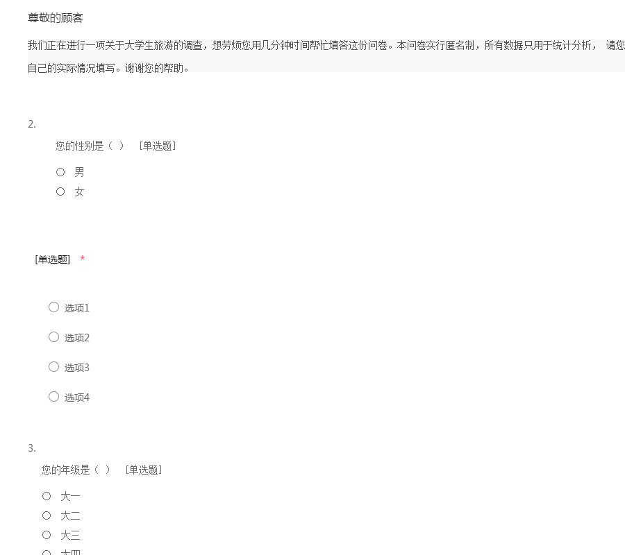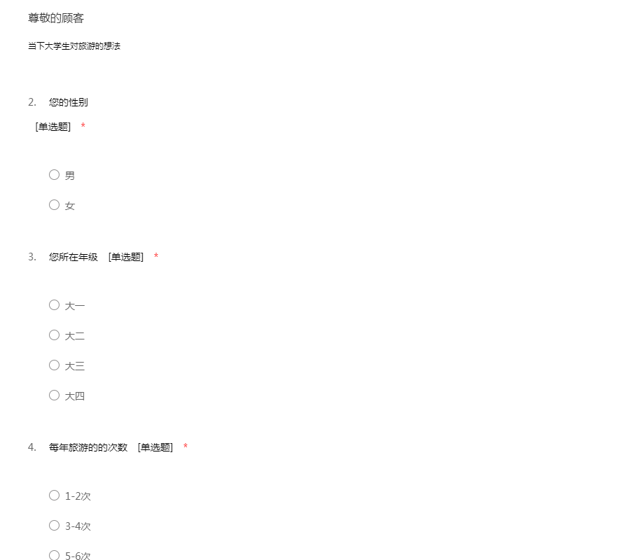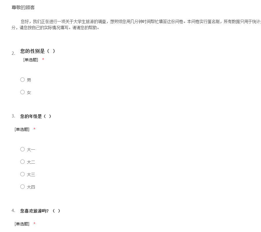 打扰各位同学们了,这是一份关于大学生旅游问卷调查,本问卷是作业要求,分析大学生旅游让您对其也有一定的了解,本次调查不记名,只需您花费几分钟的时间填写,谢谢啦。