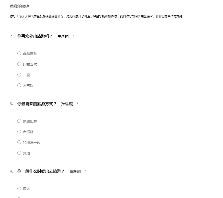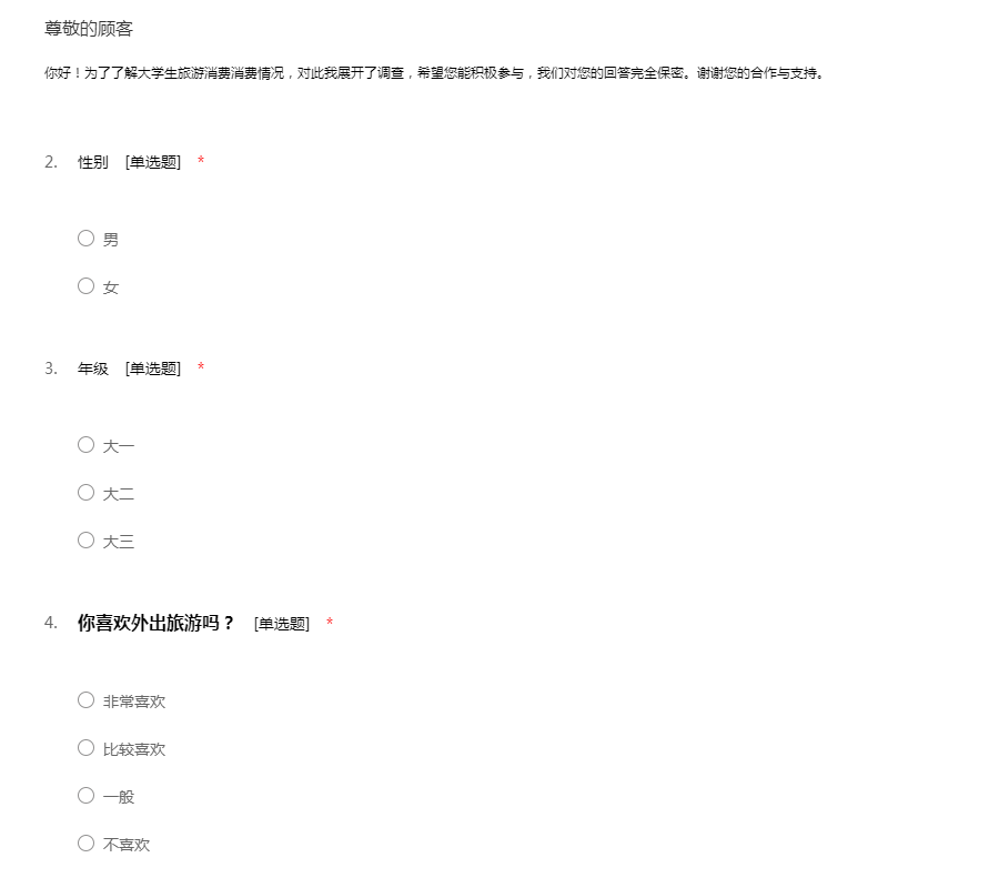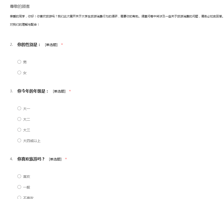 亲爱的同学,你好!你喜欢旅游吗?我们此次展开关于大学生旅游消费行为的调研,需要你的帮助。调查问卷中将涉及一些关于旅游消费的问题,请务必如实回答。你的填答,将会影响到我们的调查结果。感谢你对我们的理解与配合!