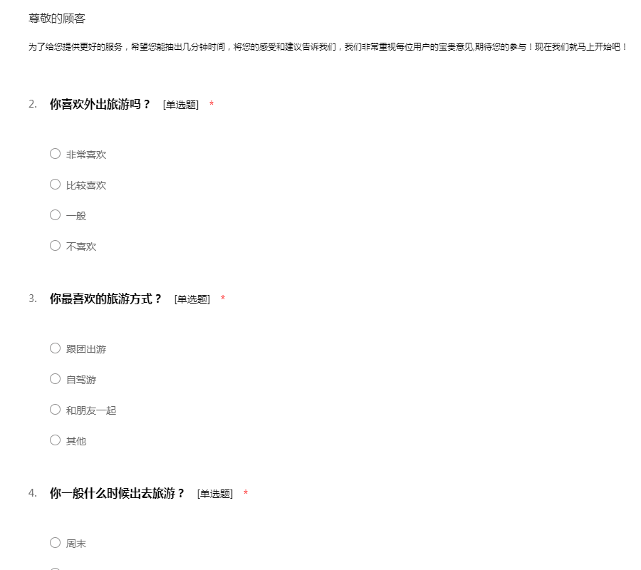 欢迎参加“大学生对旅游的调研问卷”的调查工作!此次调查旨在通过对活动满意度的调查,从而对集团的相关方面做出改进。希望您抽出一点时间积极配合我们的调查工作,谢谢您的参与。
