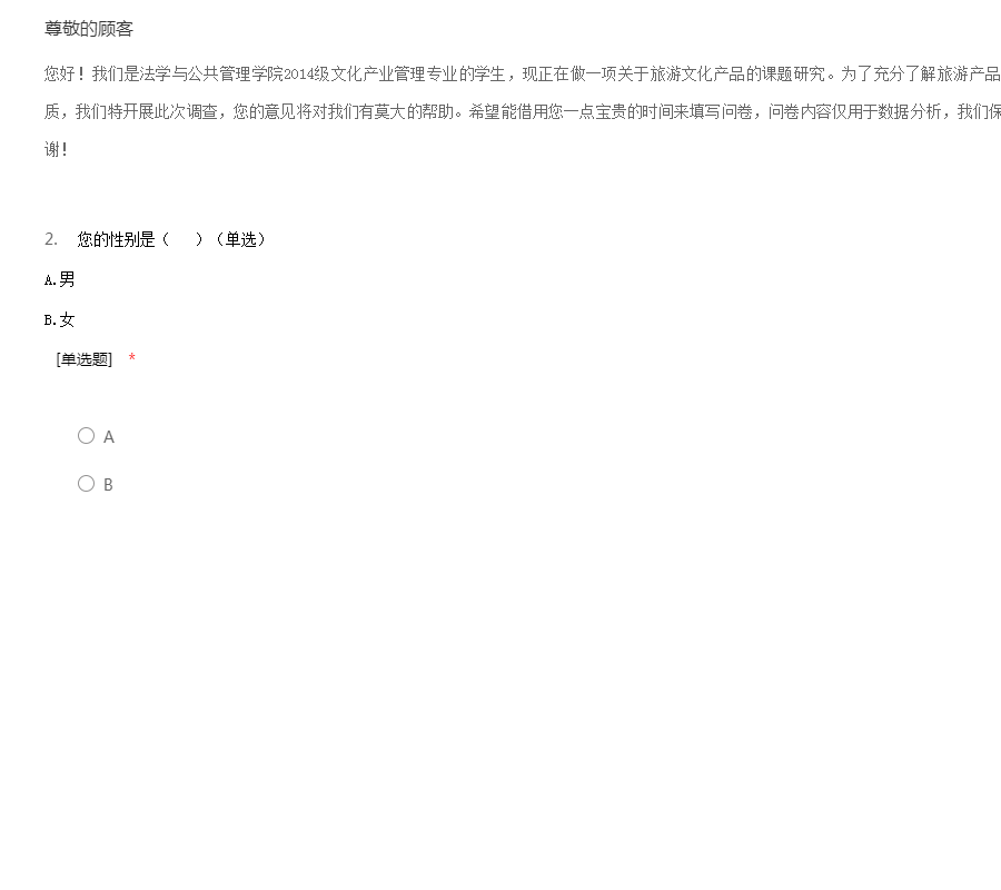 您好!我们是法学与公共管理学院2014级文化产业管理专业的学生,现正在做一项关于旅游文化产品的课题研究。为了充分了解旅游产品发展状况,提升旅游文化产品的特色和品质,我们特开展此次调查,您的意见将对我们有莫大的帮助。希望能借用您一点宝贵的时间来填写问卷,问卷内容仅用于数据分析,我们保证不会泄露您的任何信息,请您放心,谢谢!