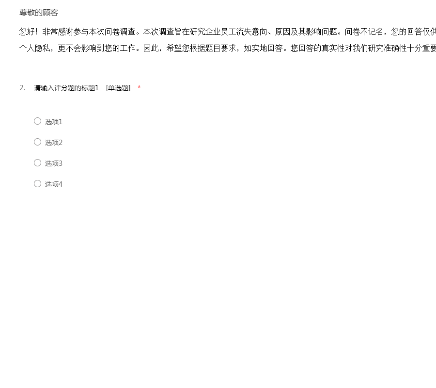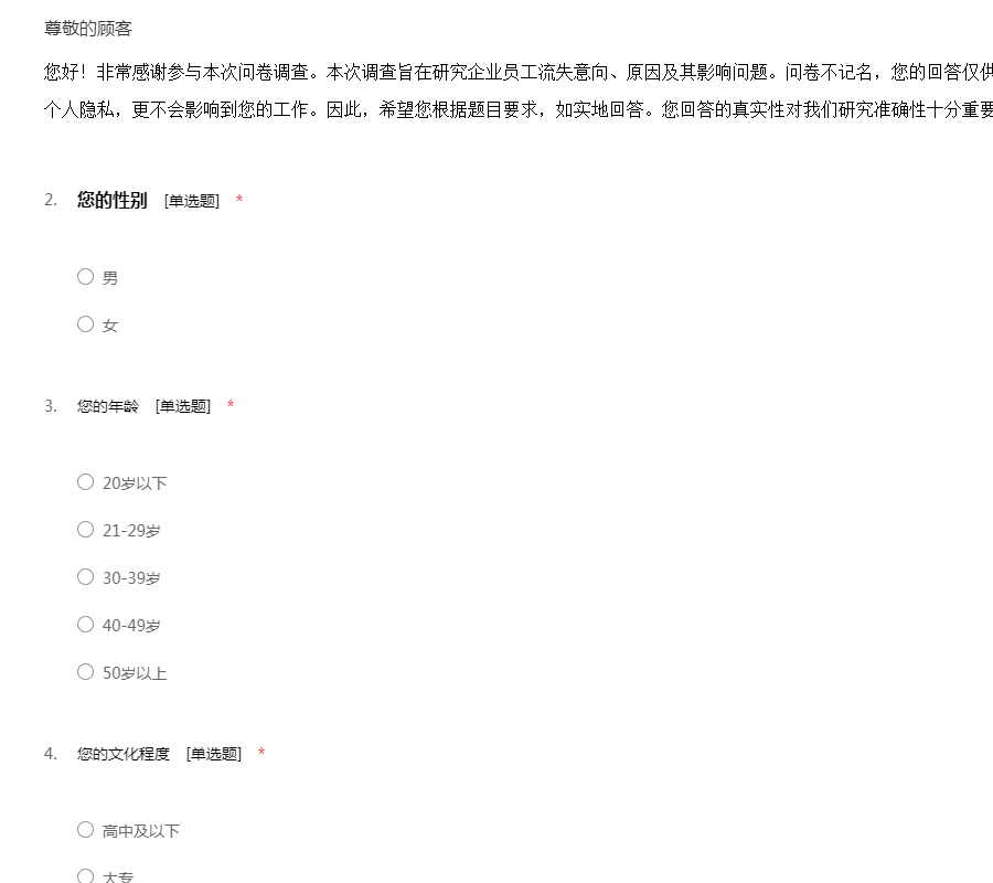 您好!非常感谢参与本次问卷调查。本次调查旨在研究企业员工流失意向、原因及其影响问题。问卷不记名,您的回答仅供研究者进行统计分析使用,不涉及个人隐私,更不会影响到您的工作。因此,希望您根据题目要求,如实地回答。您回答的真实性对我们研究准确性十分重要。