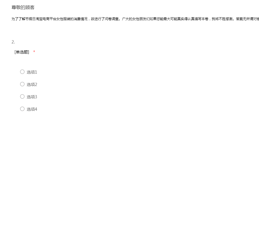 为了了解节假日淘宝电商平台女性服装的消费情况,故进行了问卷调查。广大的女性朋友们如果您能最大可能真实得认真填写本卷,我将不胜感激。答案无所谓对错,不涉及个人隐私,请放心填写!