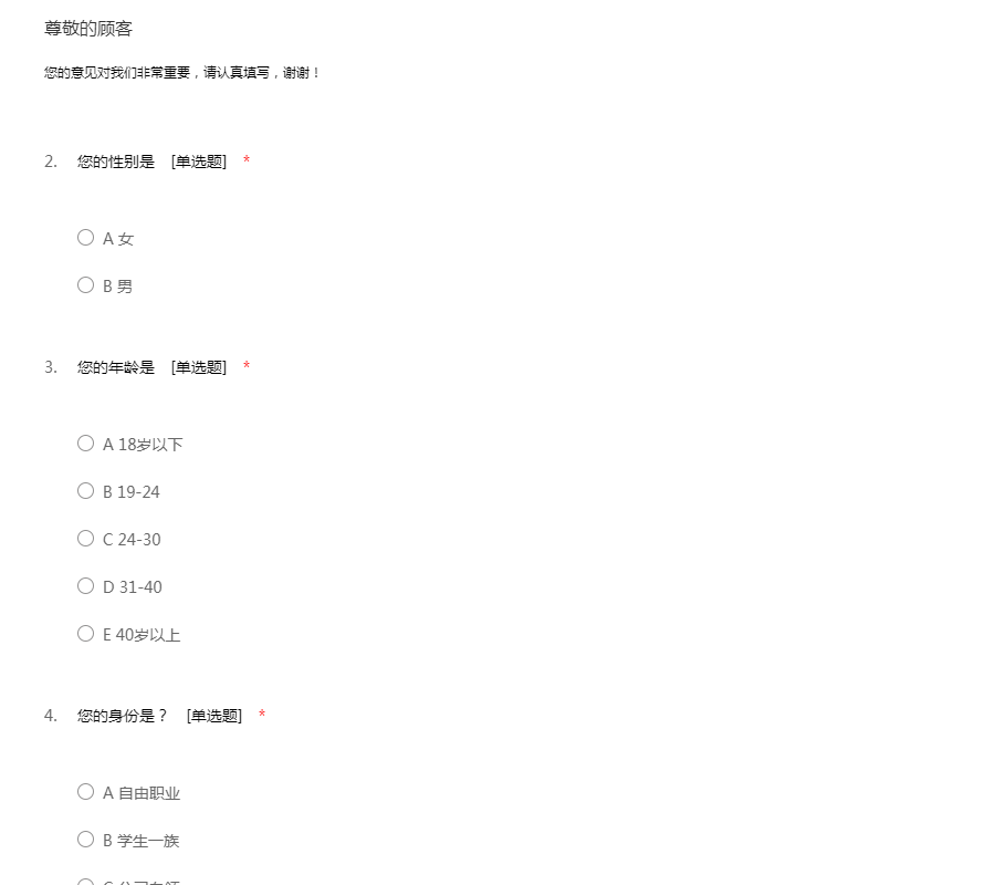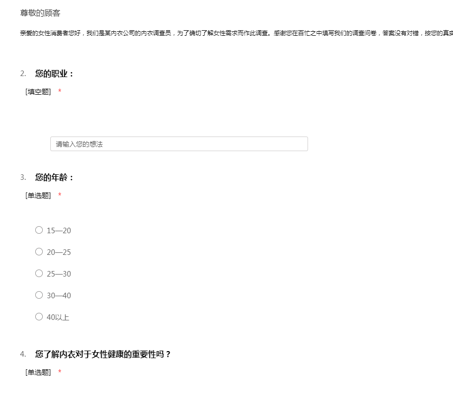 亲爱的女性消费者您好,我们是某内衣公司的内衣调查员,为了确切了解女性需求而作此调查。感谢您在百忙之中填写我们的调查问卷,答案没有对错,按您的真实意愿填写即可。再次感谢您的配合与鼓励。