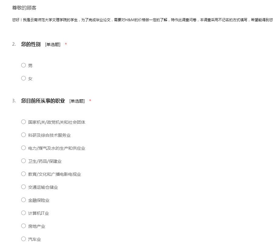 您好!我是云南师范大学文理学院的学生,为了完成毕业论文,需要对H&M的价格做一定的了解,特作此调查问卷,本调查采用不记名的方式填写,希望能得到您的合作与支持,谢谢!