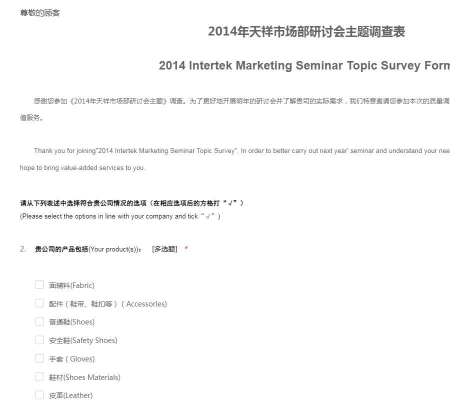 Thank you for joining"2014 Intertek Marketing Seminar Topic Survey". In order to better carry out next year' seminar and understand your needs. We invited you to join this survey and hope to bring value-added services to you.