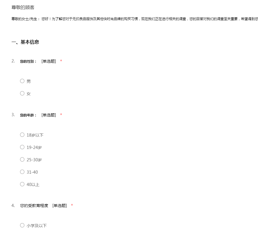 尊敬的女士/先生: 您好!为了解您对于无印良品服饰及其他快时尚品牌的购买习惯,现在我们正在进行相关的调查,您的回答对我们的调查至关重要,希望得到您的支持,谢谢您的合作! 祝您工作愉快!
