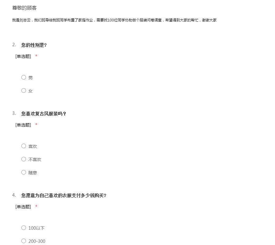 我是刘志云,我们班导给我班同学布置了家庭作业,需要找100位同学协助做个服装问卷调查,希望得到大家的帮忙,谢谢大家