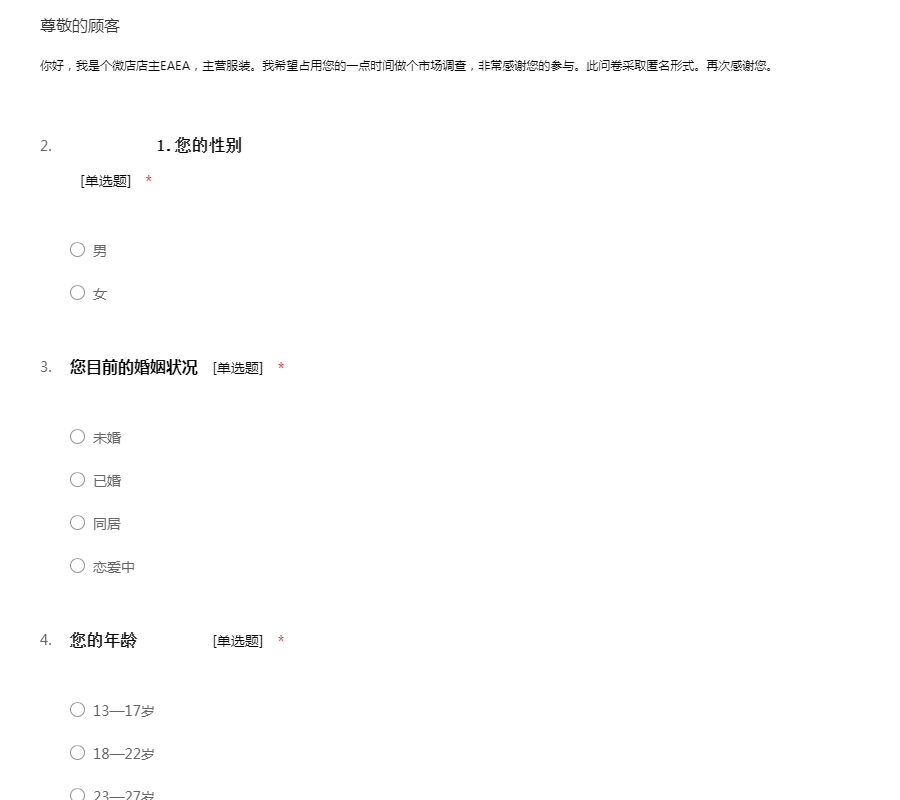 你好,我是个微店店主EAEA,主营服装。我希望占用您的一点时间做个市场调查,非常感谢您的参与。此问卷采取匿名形式。再次感谢您。