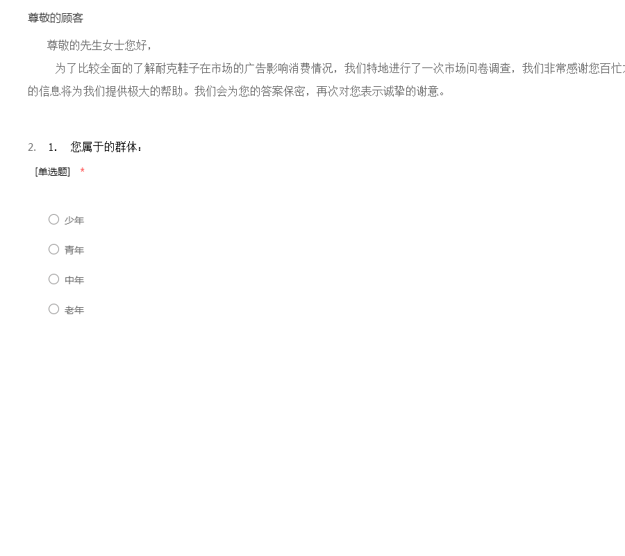 尊敬的先生女士您好, 为了比较全面的了解耐克鞋子在市场的广告影响消费情况,我们特地进行了一次市场问卷调查,我们非常感谢您百忙之中抽出时间填写这份问卷。你给出的信息将为我们提供极大的帮助。我们会为您的答案保密,再次对您表示诚挚的谢意。