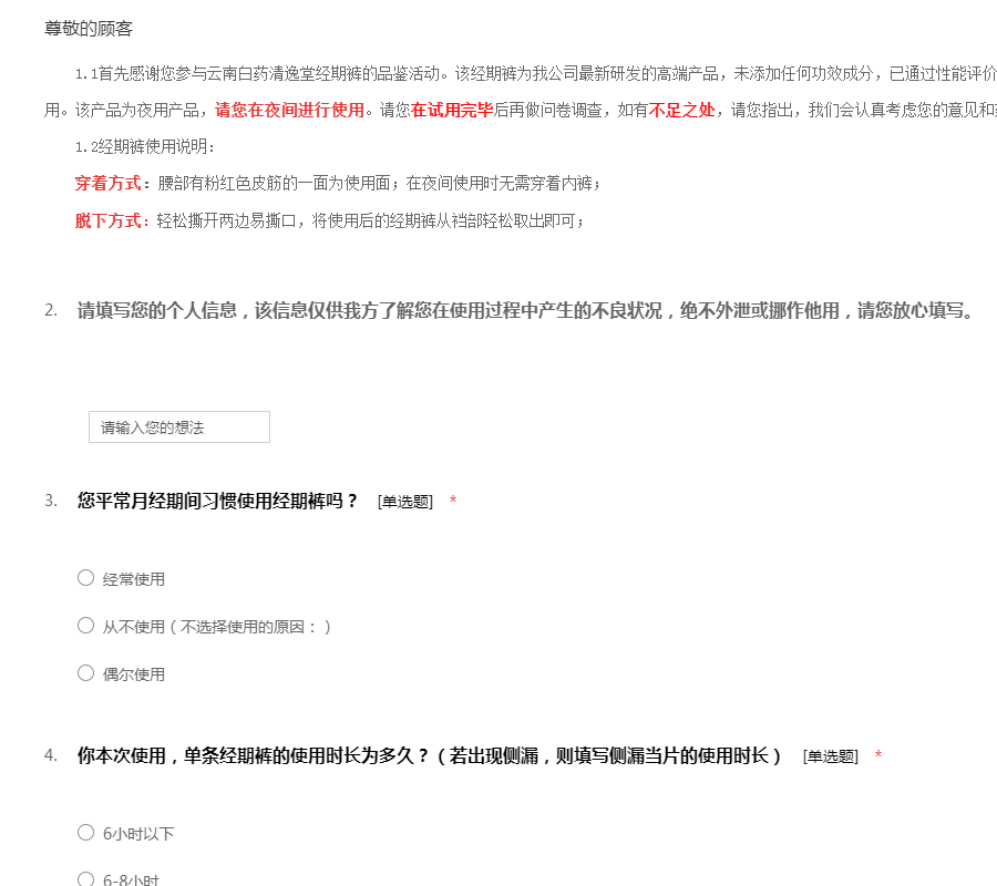 1.1首先感谢您参与云南白药清逸堂经期裤的品鉴活动。该经期裤为我公司最新研发的高端产品,未添加任何功效成分,已通过性能评价、质量检验以及微生物检验,请您放心使用。该产品为夜用产品,请您在夜间进行使用。请您在试用完毕后再做问卷调查,如有不足之处,请您指出,我们会认真考虑您的意见和建议,真诚期待您的真实反馈。