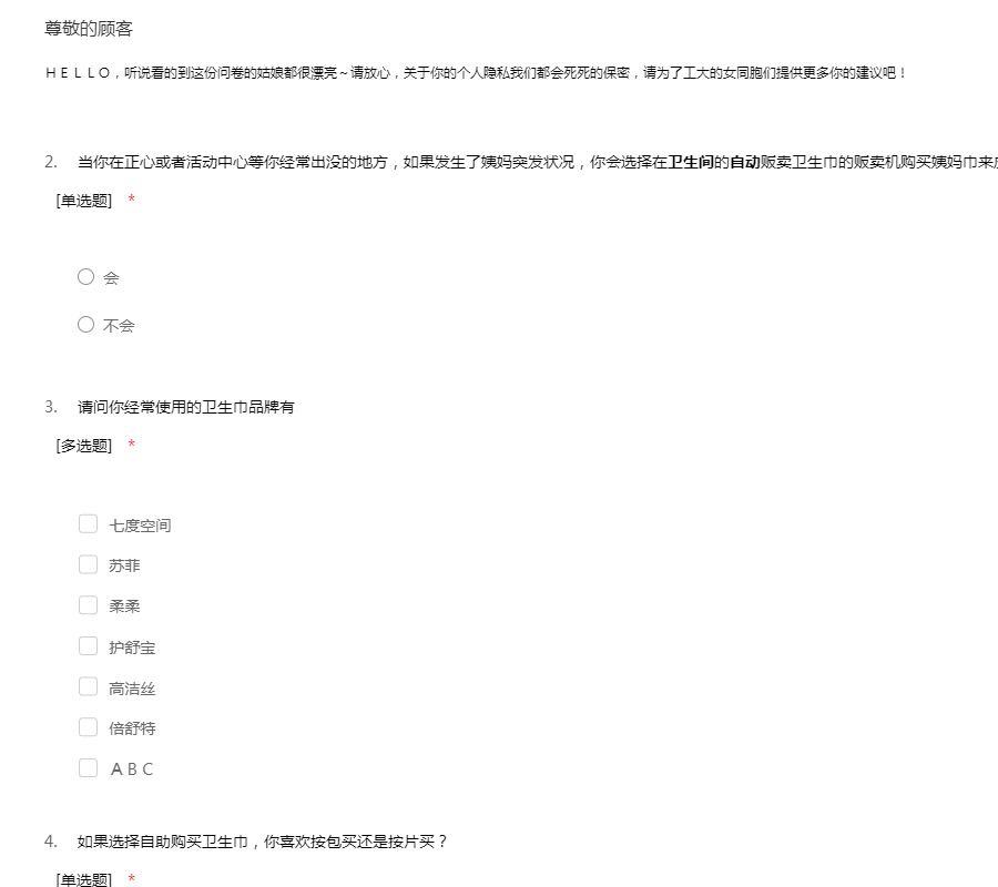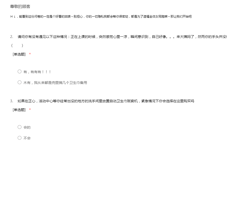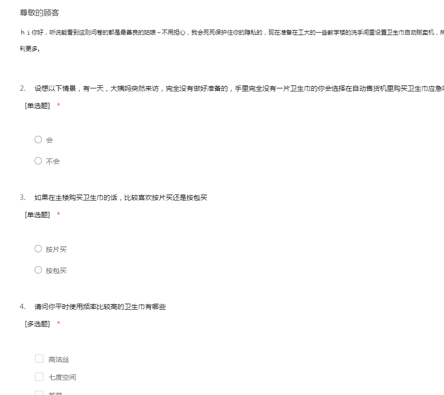 您好,谢谢您在百忙之中填写这一份问卷,我们正在进行一项关于在女生宿舍放置卫生巾自助售货机可行性的调查活动。您的回答无所谓对错,只要真实反映您的看法达到调查目的即可,谢谢您的支持与合作!
