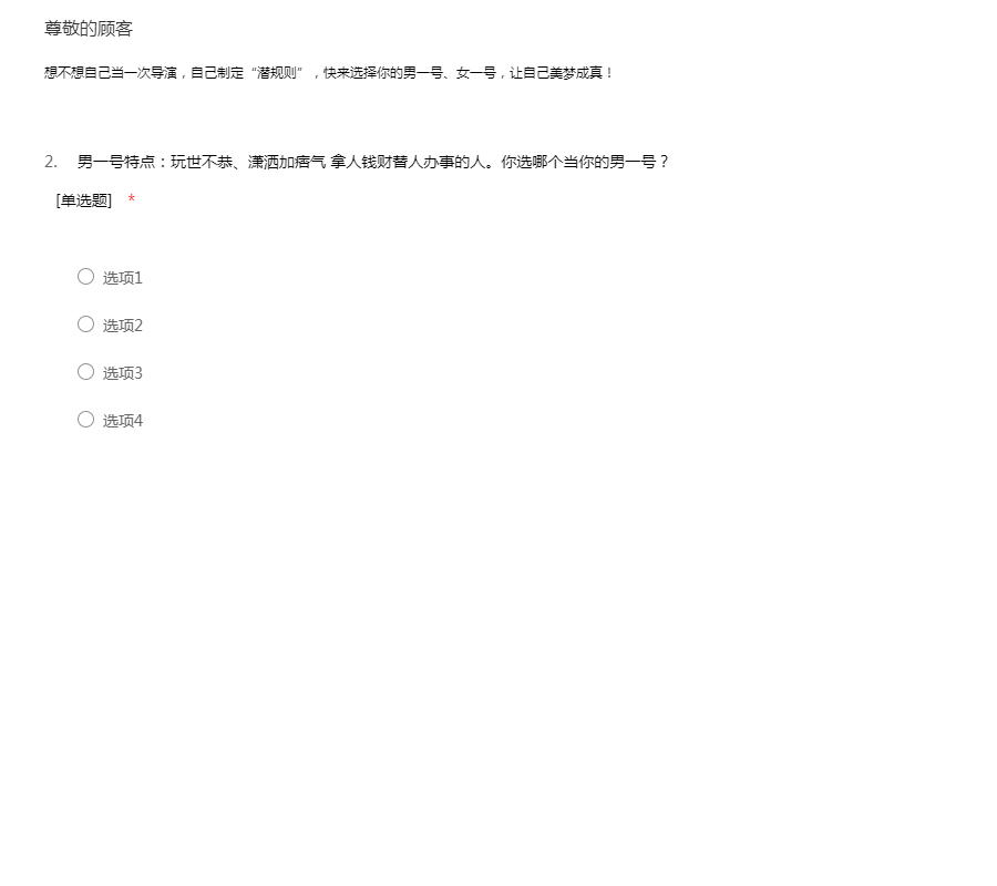 尊敬的先生/女士:您好!非常感谢您参与本次答卷!我们正在进行一项有关女生穿着喜好的小调查。您的观点和意见会被严格保密,最终仅被用于汇总后的统计分析,请您放心填写。