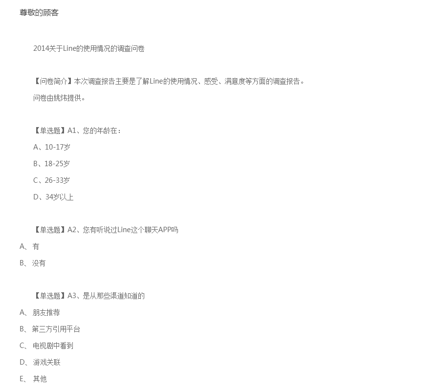 问卷由姚炜提供。2014关于Line的使用情况的调查问卷