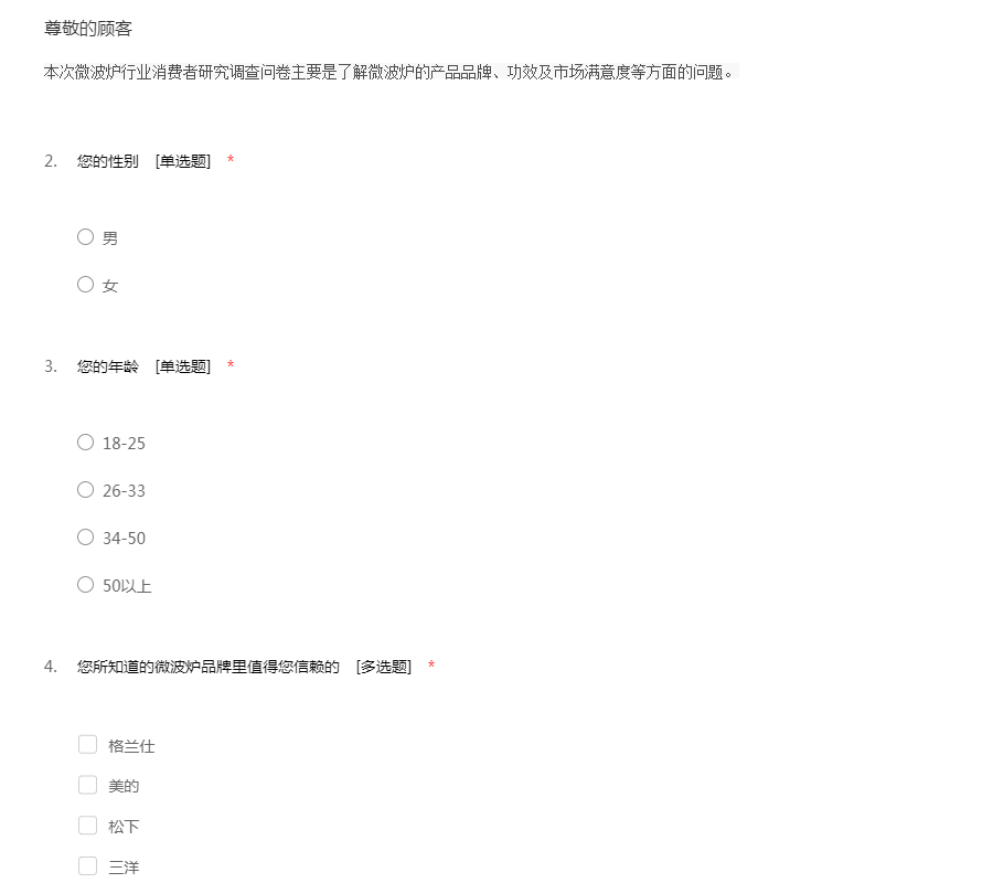 本次微波炉行业消费者研究调查问卷主要是了解微波炉的产品品牌、功效及市场满意度等方面的问题。
