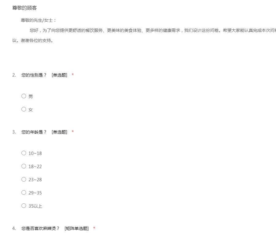 尊敬的先生/女士: 您好,为了向您提供更舒适的餐饮服务、更美味的美食体验、更多样的健康需求,我们设计这份问卷。希望大家能认真完成本次问卷,为我们改善自我提供宝贵的数据和建议。谢谢各位的支持。