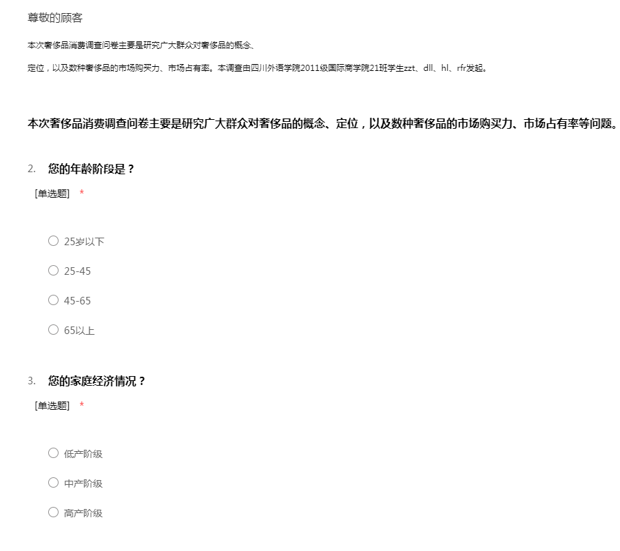 本次奢侈品消费调查问卷主要是研究广大群众对奢侈品的概念、 定位,以及数种奢侈品的市场购买力、市场占有率。本调查由四川外语学院2011级国际商学院21班学生zzt、dll、hl、rfr发起。