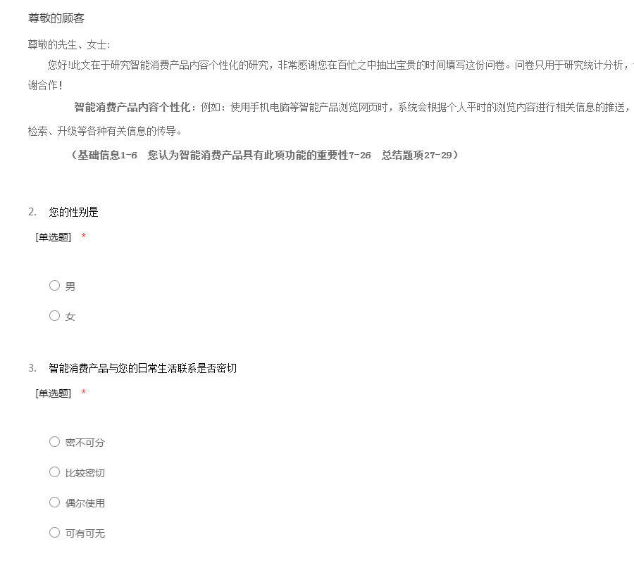尊敬的先生、女士:您好!此文在于研究智能消费产品内容个性化的研究,非常感谢您在百忙之中抽出宝贵的时间填写这份问卷。问卷只用于研究统计分析,仅用于学术研究,希望得到您的支持。谢谢合作! 智能消费产品内容个性化:例如:使用手机电脑等智能产品浏览网页时,系统会根据个人平时的浏览内容进行相关信息的推送,是内容个性化推荐,除此之外还有个性化检索、升级等各种有关信息的传导。 (基础信息1-6 您认为智能消费产品具有此项功能的重要性7-26 总结题项27-29)