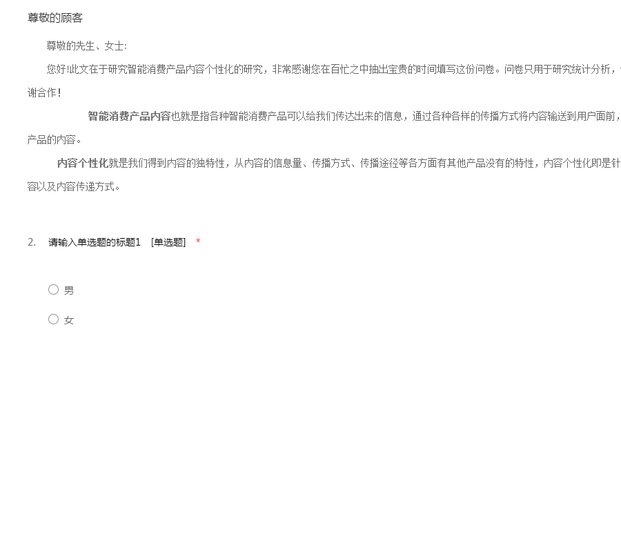 尊敬的先生、女士:您好!此文在于研究智能消费产品内容个性化的研究,非常感谢您在百忙之中抽出宝贵的时间填写这份问卷。问卷只用于研究统计分析,仅用于学术研究,希望得到您的支持。谢谢合作! 智能消费产品内容也就是指各种智能消费产品可以给我们传达出来的信息,通过各种各样的传播方式将内容输送到用户面前,用户从中得到一些信息,这就是智能消费产品的内容。 内容个性化就是我们得到内容的独特性,从内容的信息量、传播方式、传播途径等各方面有其他产品没有的特性,内容个性化即是针对不同的用户或顾客提供不同的形式的内容以及内容传递方式。