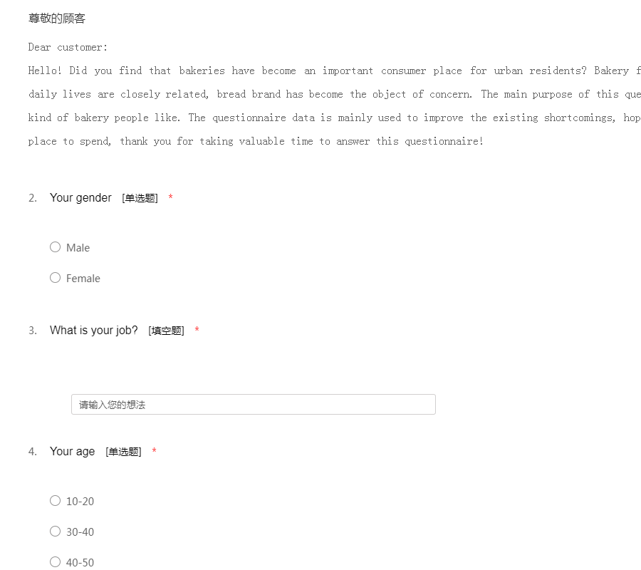Hello! Did you find that bakeries have become an important consumer place for urban residents? Bakery food and facilities and people's daily lives are closely related, bread brand has become the object of concern. The main purpose of this questionnaire is to understand what kind of bakery people like. The questionnaire data is mainly used to improve the existing shortcomings, hoping to provide you with a better place to spend, thank you for taking valuable time to answer this questionnaire!