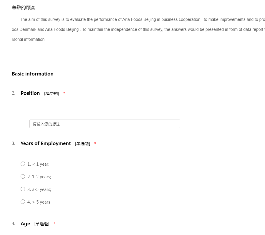 The aim of this survey is to evaluate the performance of Arla Foods Beijing in business cooperation, to make improvements and to promote better cooperation between Arla Foods Denmark and Arla Foods Beijing . To maintain the independence of this survey, the answers would be presented in form of data report to ensure the confidentiality of detailed personal information