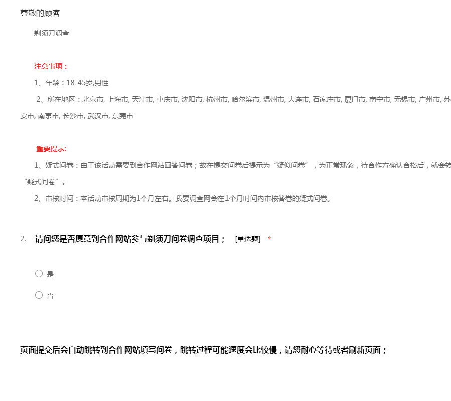 1、疑式问卷:由于该活动需要到合作网站回答问卷;故在提交问卷后提示为“疑似问卷”,为正常现象,待合作方确认合格后,就会转为合格问卷。我们会分批次审核报名的“疑式问卷”。