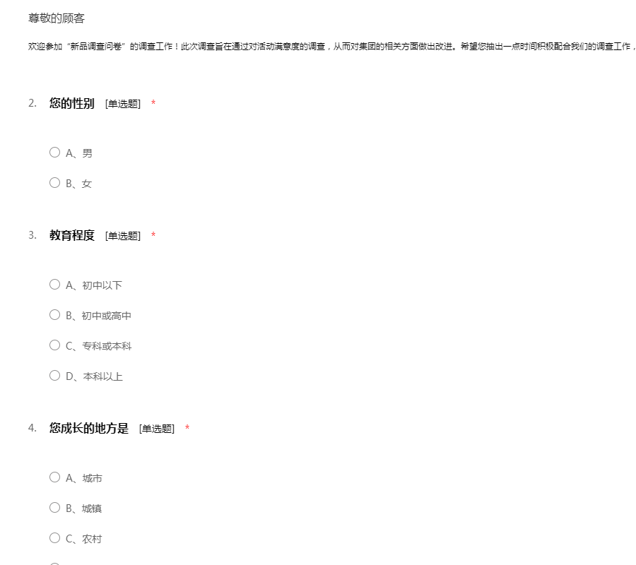 欢迎参加“新品调查问卷”的调查工作!此次调查旨在通过对活动满意度的调查,从而对集团的相关方面做出改进。希望您抽出一点时间积极配合我们的调查工作,谢谢您的参与。