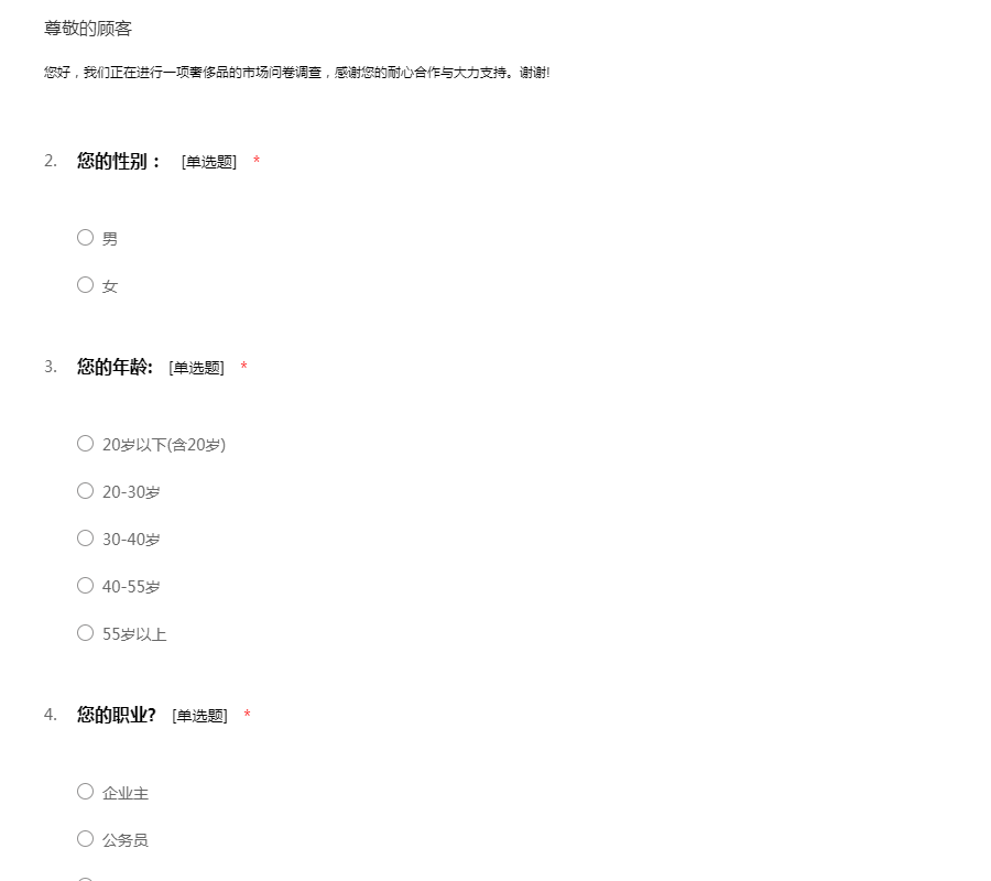 您好,我们正在进行一项奢侈品的市场问卷调查,感谢您的耐心合作与大力支持。谢谢!