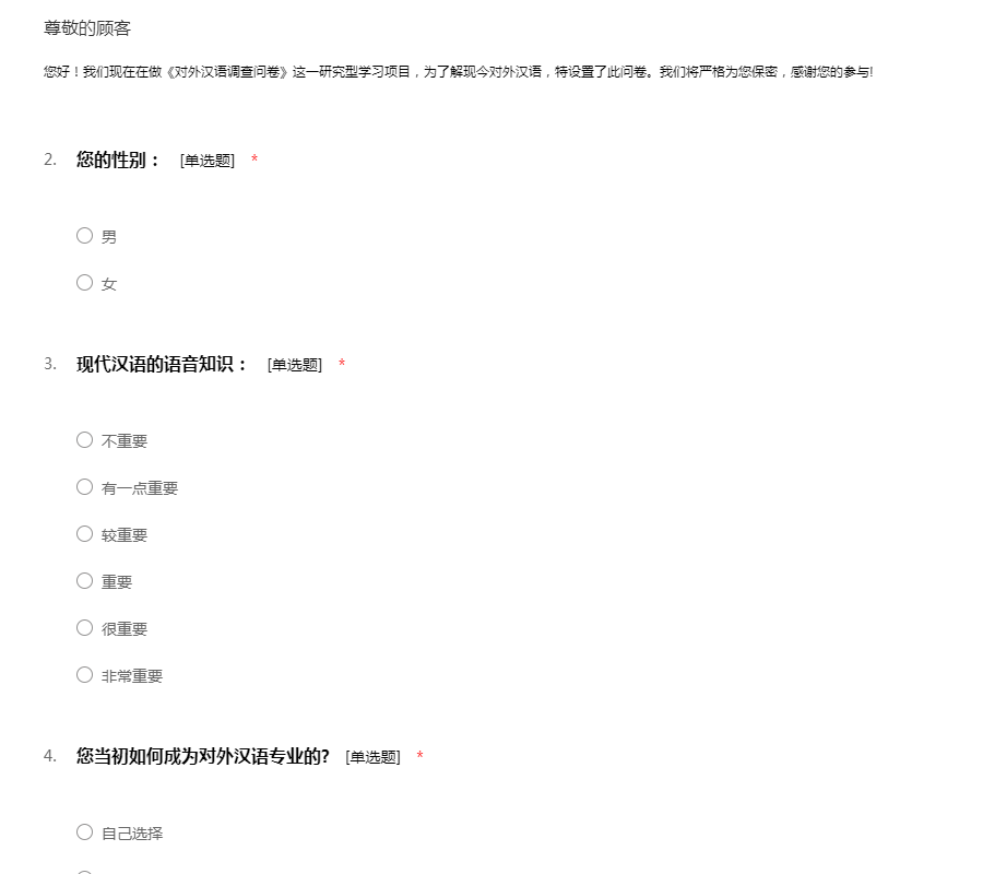 您好!我们现在在做《对外汉语调查问卷》这一研究型学习项目,为了解现今对外汉语,特设置了此问卷。我们将严格为您保密,感谢您的参与!