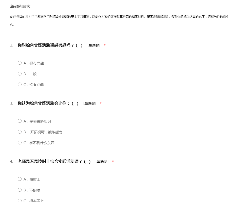 此问卷目的是为了了解同学们对综合实践课的基本学习情况,以此作为我们课程改革研究的档案材料。答案无所谓对错,希望你能抱以认真的态度,选择与你的真实情况相符合的答案,积极配合我们做好研究工作。