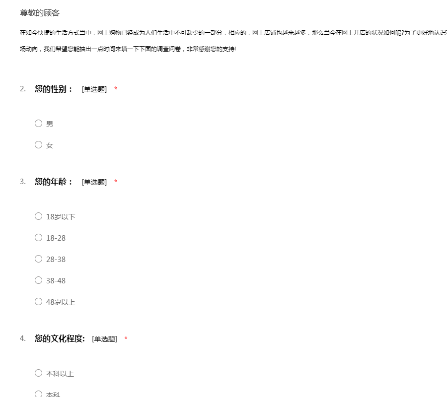 在如今快捷的生活方式当中,网上购物已经成为人们生活中不可缺少的一部分,相应的,网上店铺也越来越多,那么当今在网上开店的状况如何呢?为了更好地认识和了解网上开店的拥有状况和需求状况,把握市场动向,我们希望您能抽出一点时间来填一下下面的调查问卷,非常感谢您的支持!