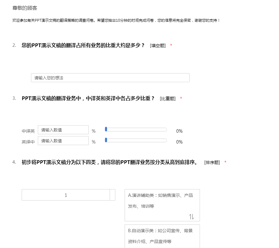 欢迎参加有关PPT演示文稿的翻译策略的调查问卷。希望您抽出10分钟的时间完成问卷,您的信息将完全保密,谢谢您的支持!