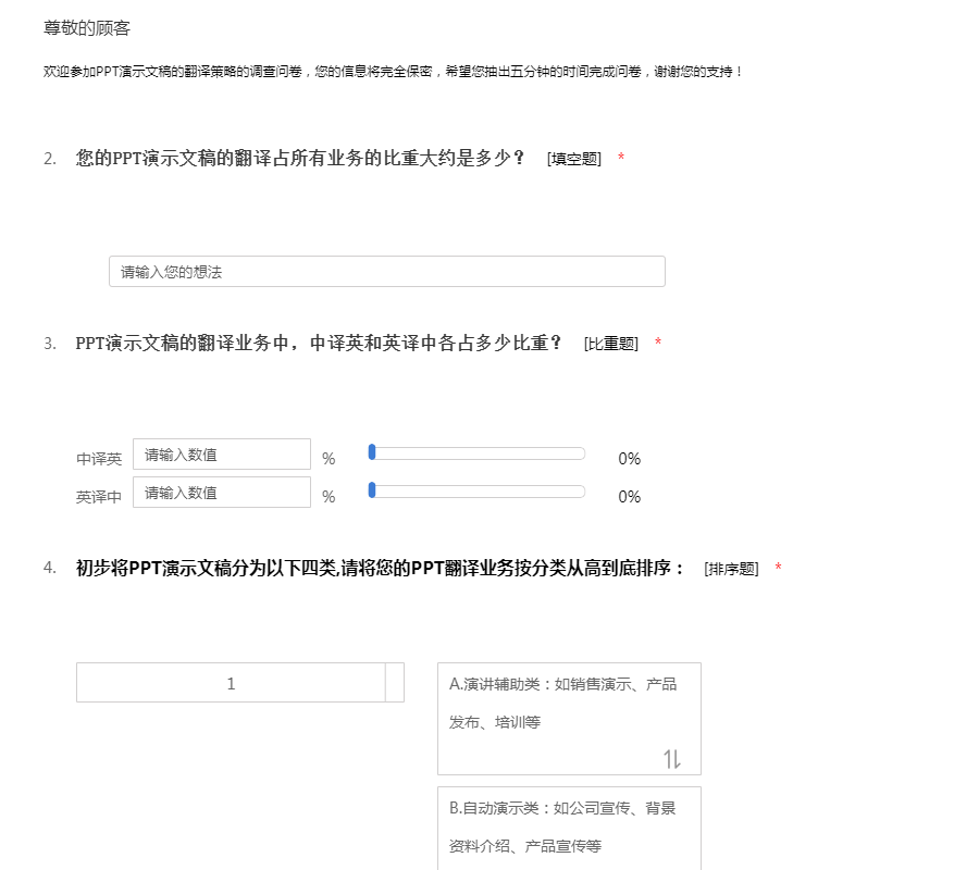 欢迎参加PPT演示文稿的翻译策略的调查问卷,您的信息将完全保密,希望您抽出五分钟的时间完成问卷,谢谢您的支持!