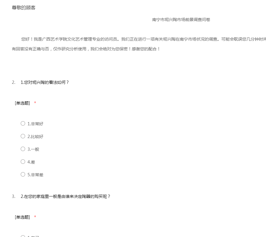 南宁市坭兴陶市场前景调查问卷 您好!我是广西艺术学院文化艺术管理专业的访问员。我们正在进行一项有关坭兴陶在南宁市场状况的调查。可能会耽误您几分钟时间,希望你协助我们一下完成调查。您的所有回答没有正确与否,仅作研究分析使用,我们会绝对为您保密!感谢您的配合!