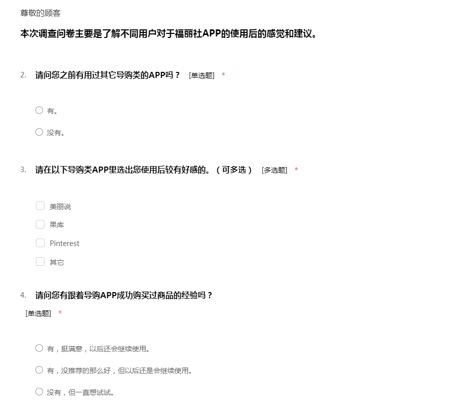 本次调查问卷主要是了解不同用户对于福丽社APP的使用后的感觉和建议。