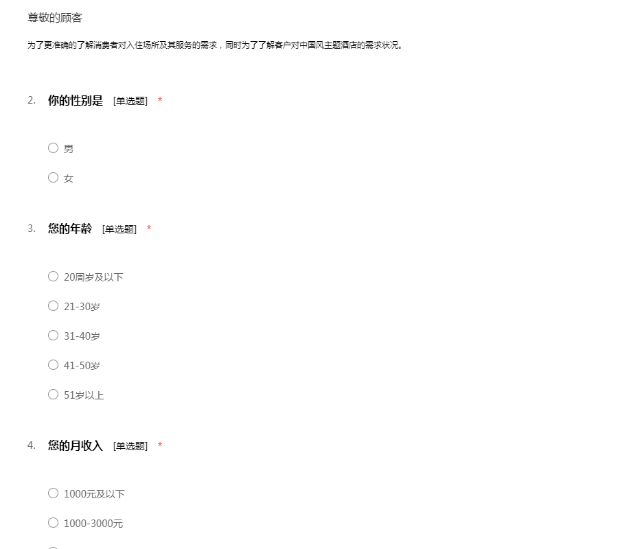 为了更准确的了解消费者对入住场所及其服务的需求,同时为了了解客户对中国风主题酒店的需求状况。
