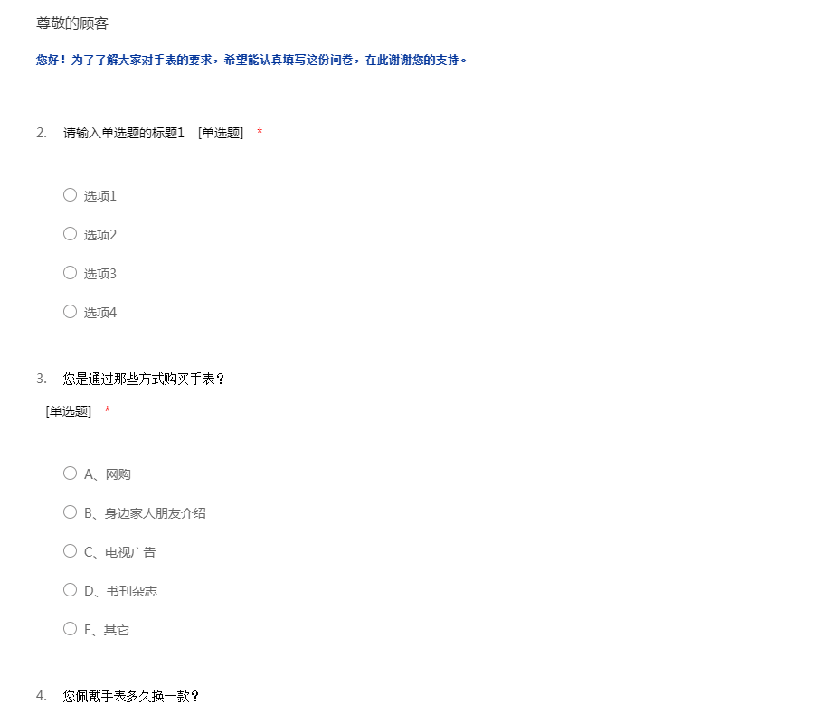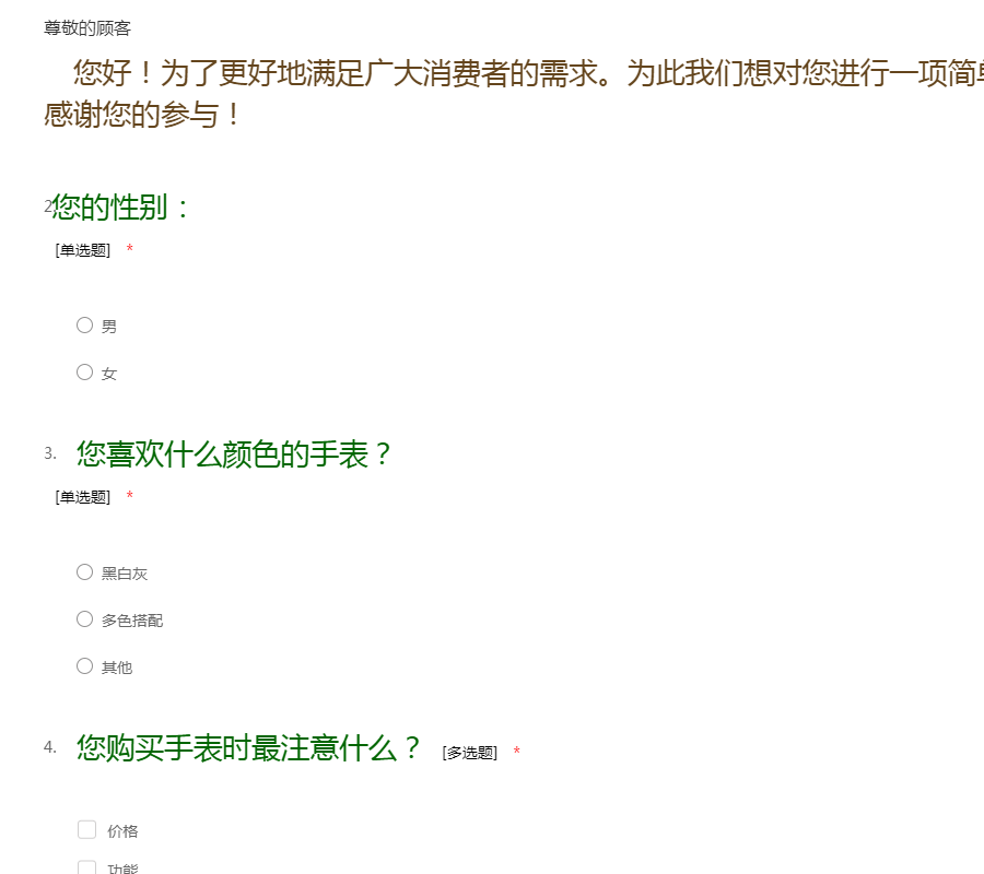 您好!为了了解大家对手表的要求,希望能认真填写这份问卷,在此谢谢您的支持。