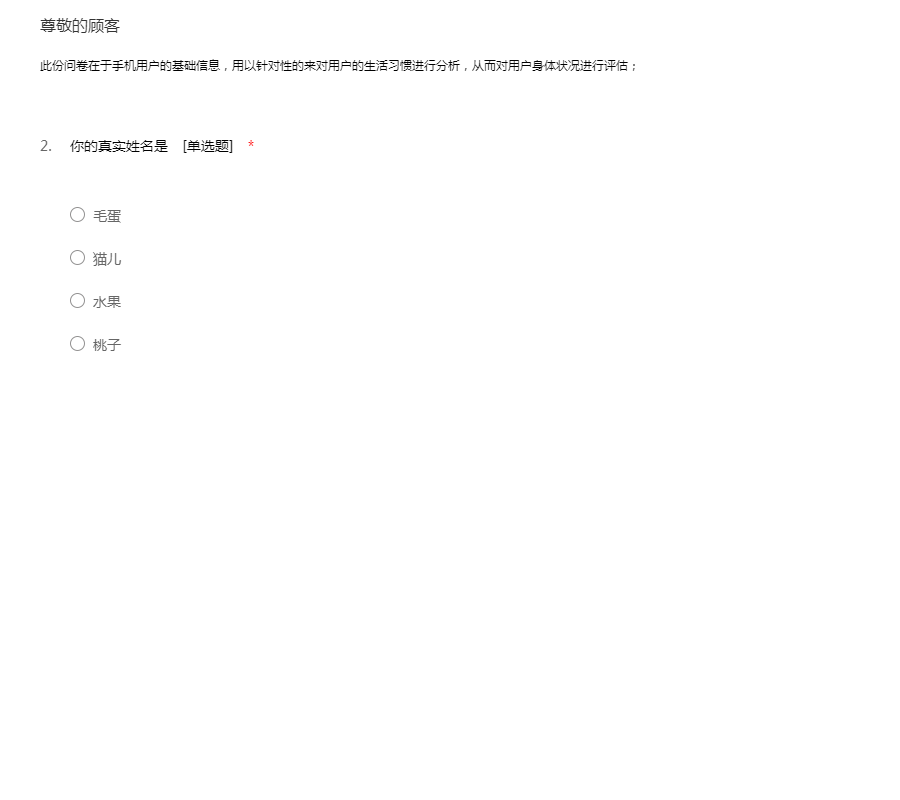 此份问卷在于手机用户的基础信息,用以针对性的来对用户的生活习惯进行分析,从而对用户身体状况进行评估;