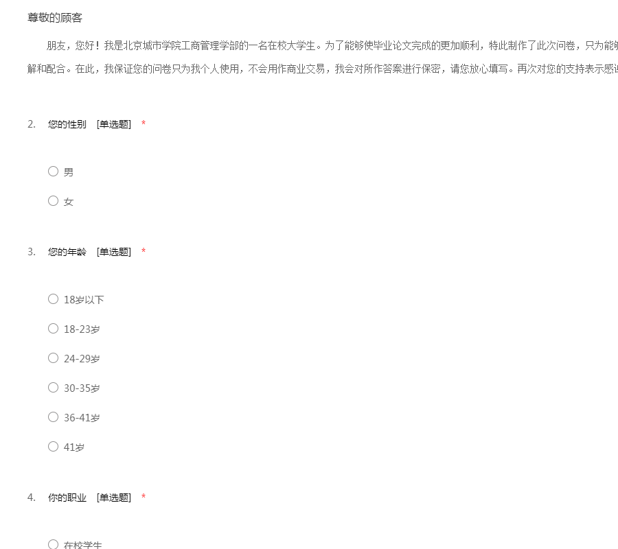 朋友,您好!我是北京城市学院工商管理学部的一名在校大学生。为了能够使毕业论文完成的更加顺利,特此制作了此次问卷,只为能够进行更加详细的调查。希望得到您的理解和配合。在此,我保证您的问卷只为我个人使用,不会用作商业交易,我会对所作答案进行保密,请您放心填写。再次对您的支持表示感谢!