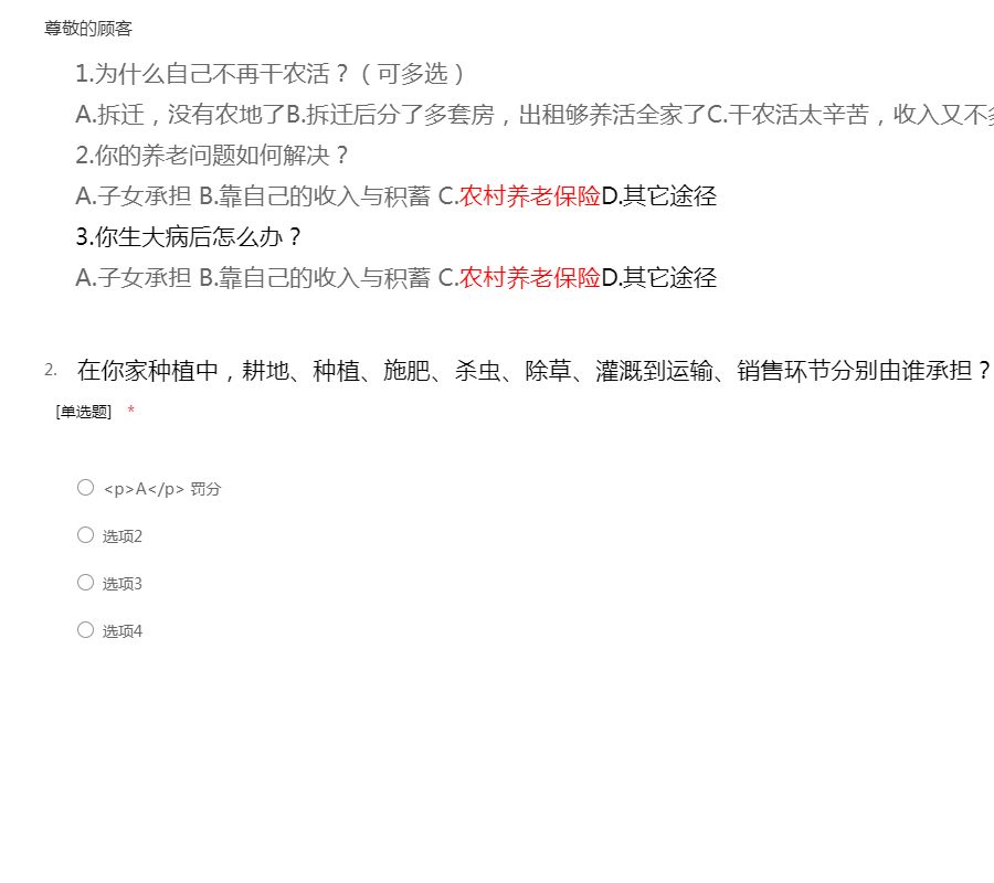 1.为什么自己不再干农活?(可多选) A.拆迁,没有农地了B.拆迁后分了多套房,出租够养活全家了C.干农活太辛苦,收入又不多D. 2.你的养老问题如何解决? A.子女承担 B.靠自己的收入与积蓄 C.农村养老保险D.其它途径 3.你生大病后怎么办? A.子女承担 B.靠自己的收入与积蓄 C.农村养老保险D.其它途径