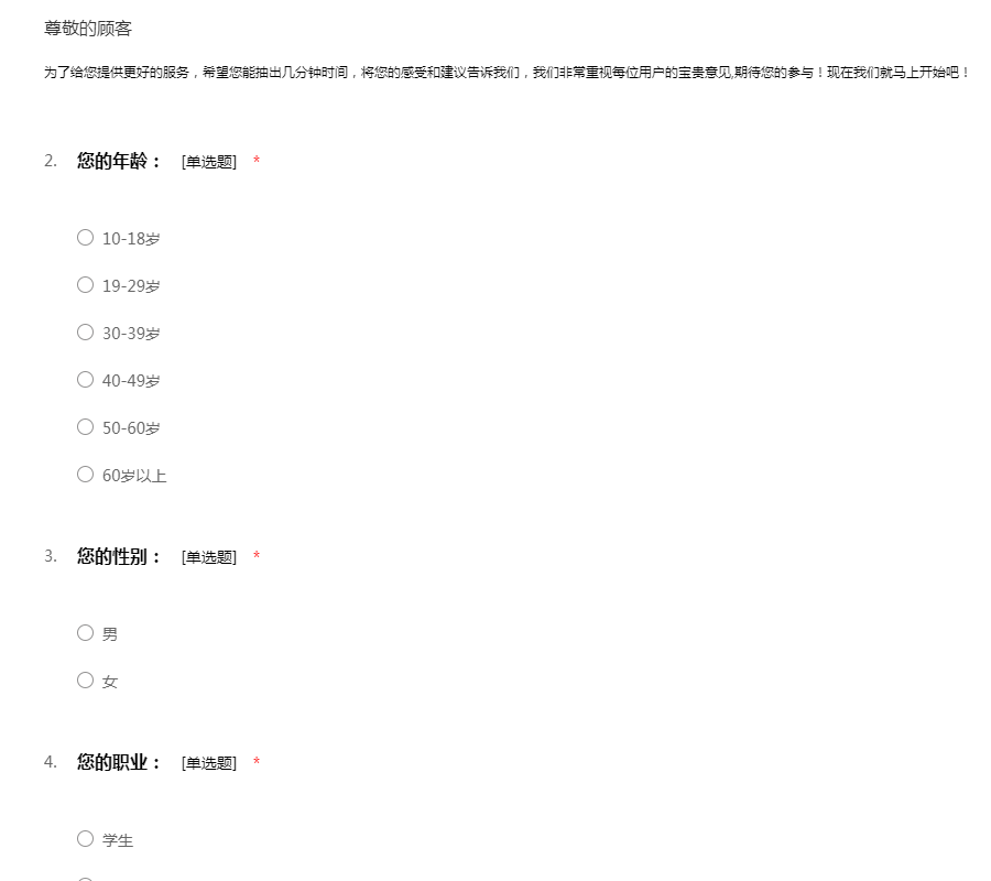 为了给您提供更好的服务,希望您能抽出几分钟时间,将您的感受和建议告诉我们,我们非常重视每位用户的宝贵意见,期待您的参与!现在我们就马上开始吧!