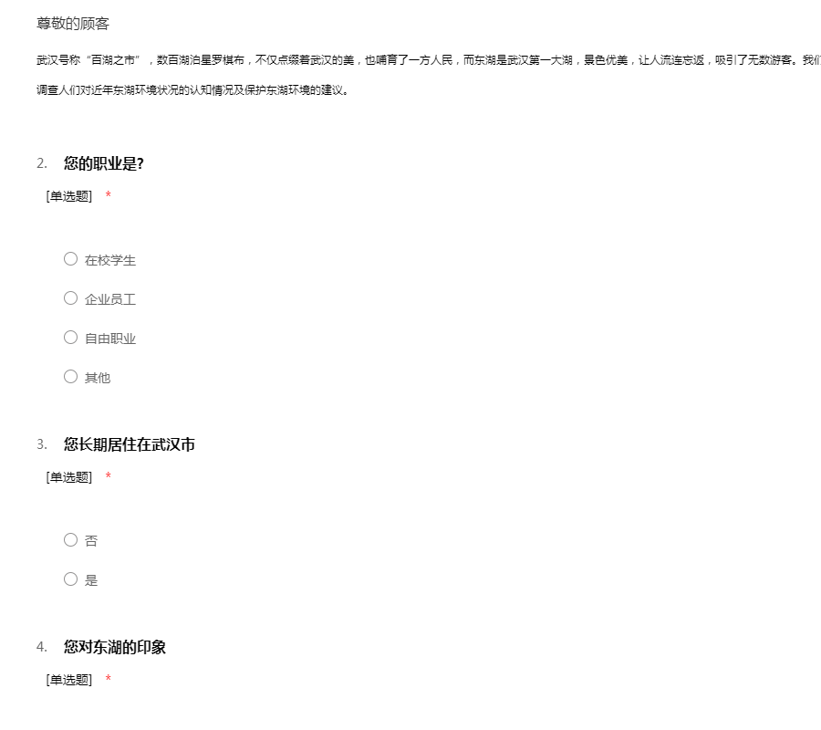 武汉号称“百湖之市”,数百湖泊星罗棋布,不仅点缀着武汉的美,也哺育了一方人民,而东湖是武汉第一大湖,景色优美,让人流连忘返,吸引了无数游客。我们是来自武汉科技大学的东湖环境调查团队,想要调查人们对近年东湖环境状况的认知情况及保护东湖环境的建议。